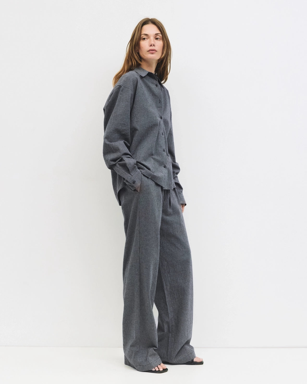 The Ellen pants by Mod Ref are oversized striped trousers crafted from brushed midweight fabric, featuring front pleats for a tailored touch. Designed with a back elastic waistband, front button, and hidden zipper closure, and two side hidden pockets