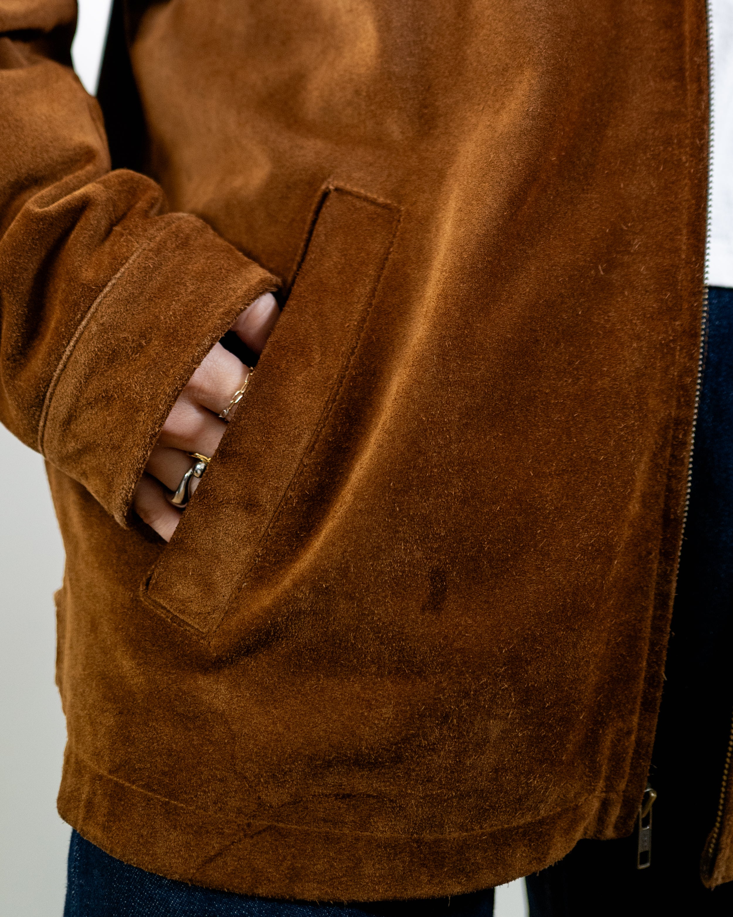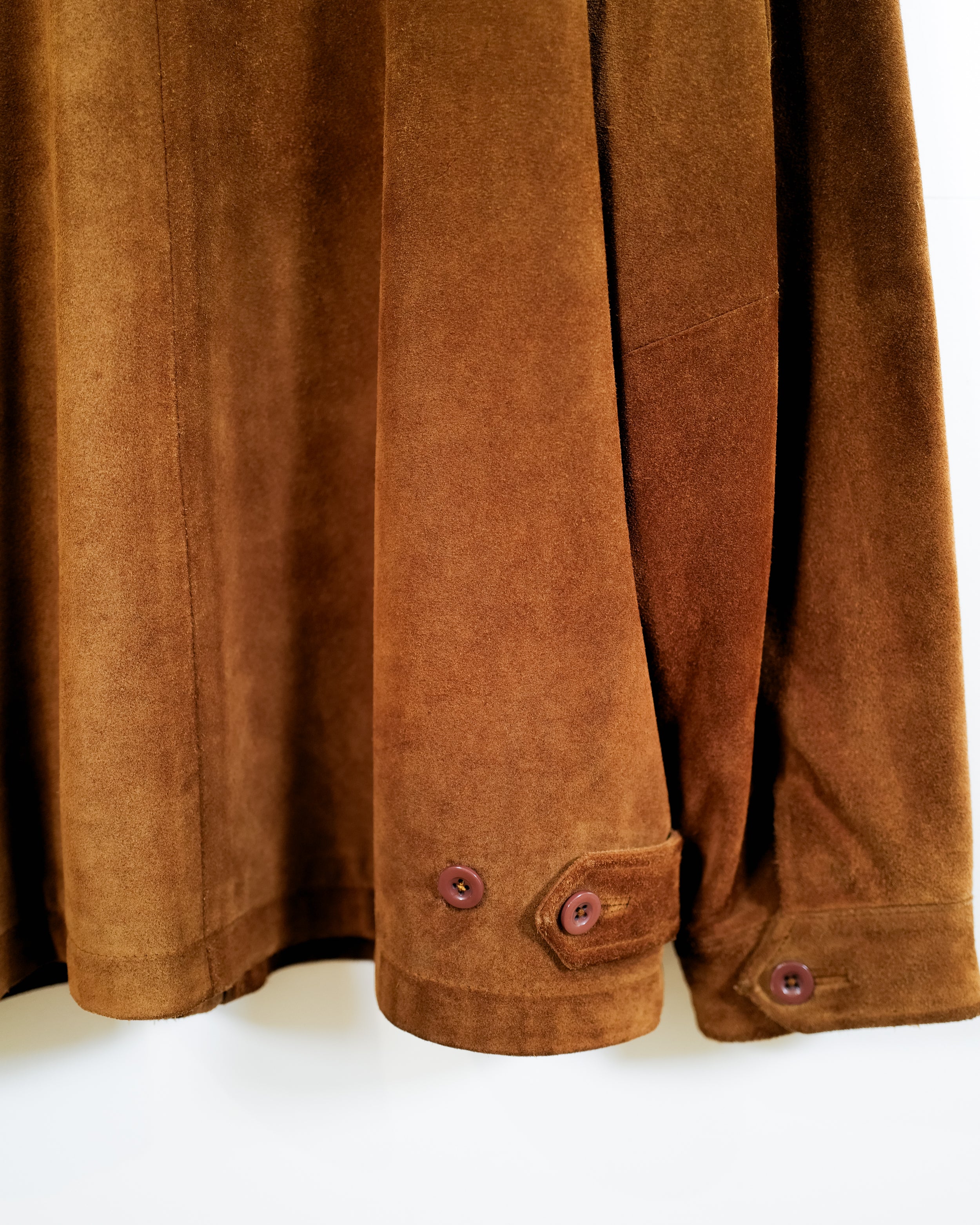 A vintage camel brown suede Jacket. Has signs of previous wear and a small stain on the right pocket (see photos). Hangs loose and comfortable. Fully lined with pockets. Suede is heavier duty and feels perfectly worn in.
