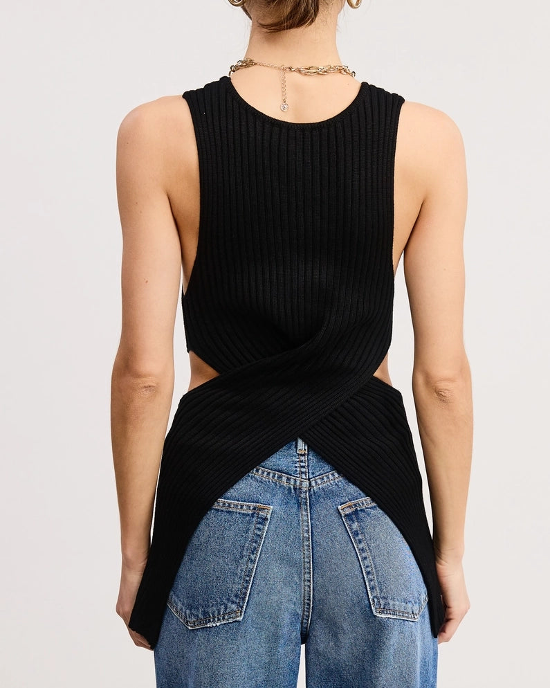 Sleeveless solid ribbed-knit sweater top featuring a unique criss-cross waist wrap detailing, side cut-outs, and a round neckline, all designed with a bodycon fit to highlight your curves.