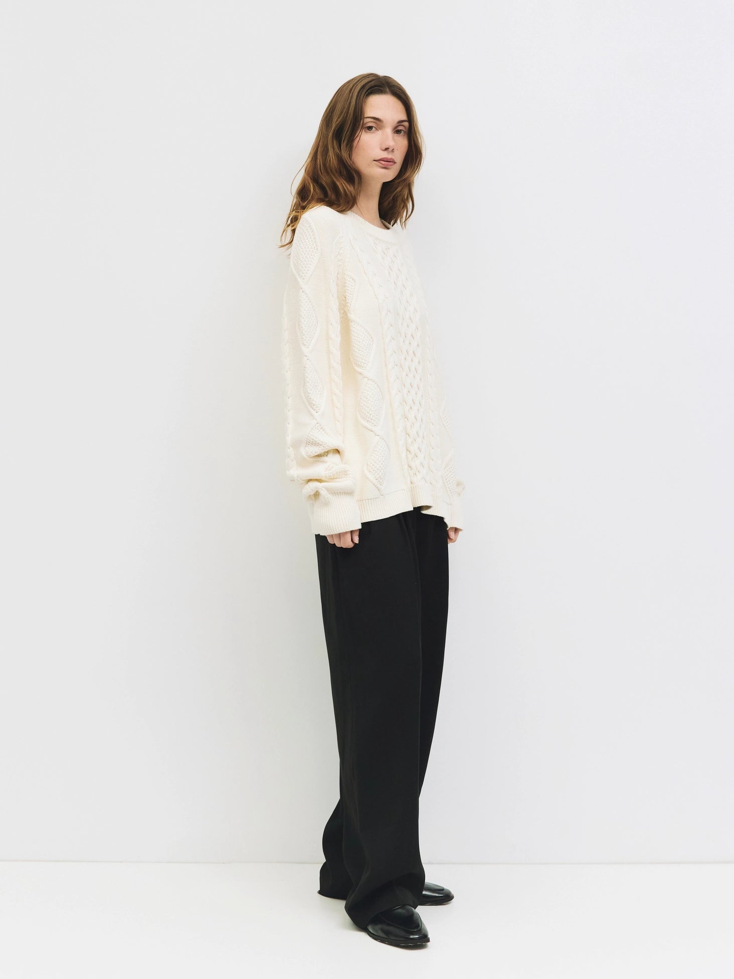 The Hallie Sweater is a cable knit crewneck with raglan long sleeves. Made from midweight yarn, it offers warmth and texture. Its oversized fit ensures a relaxed and comfortable feel.