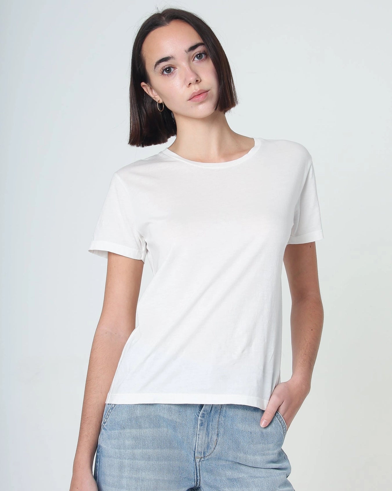 This women's crew neck t-shirt is made from a lightweight, luxury supima cotton jersey for exceptional softness and comfort. Every detail is designed for a perfect fit, wear after wear. It's made from 100% supima cotton with clean finished interior taping at the neck and center back seam.