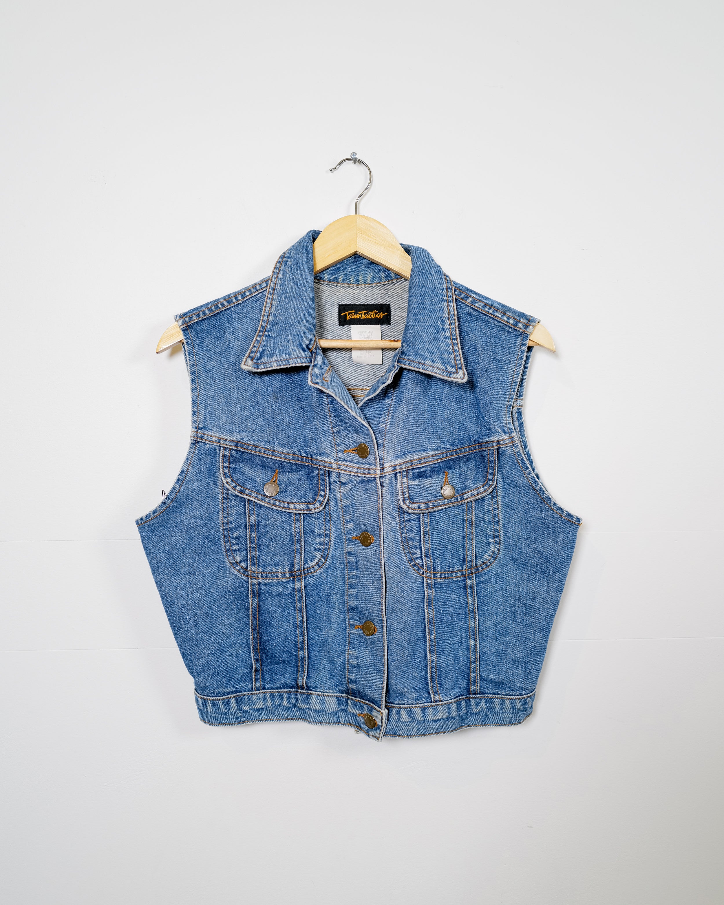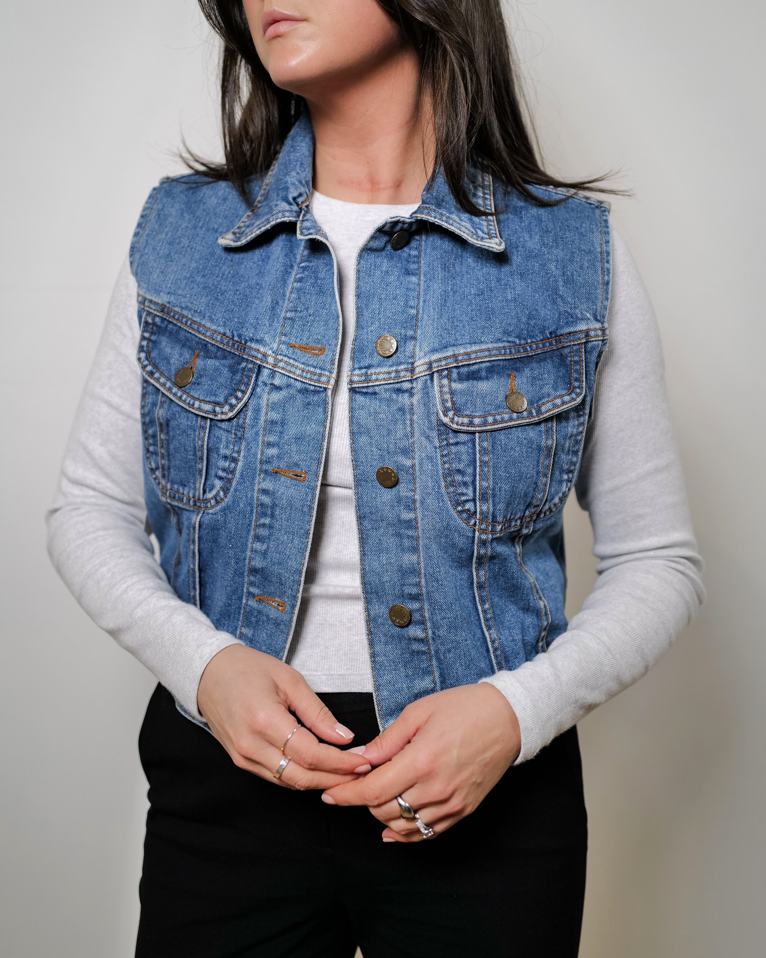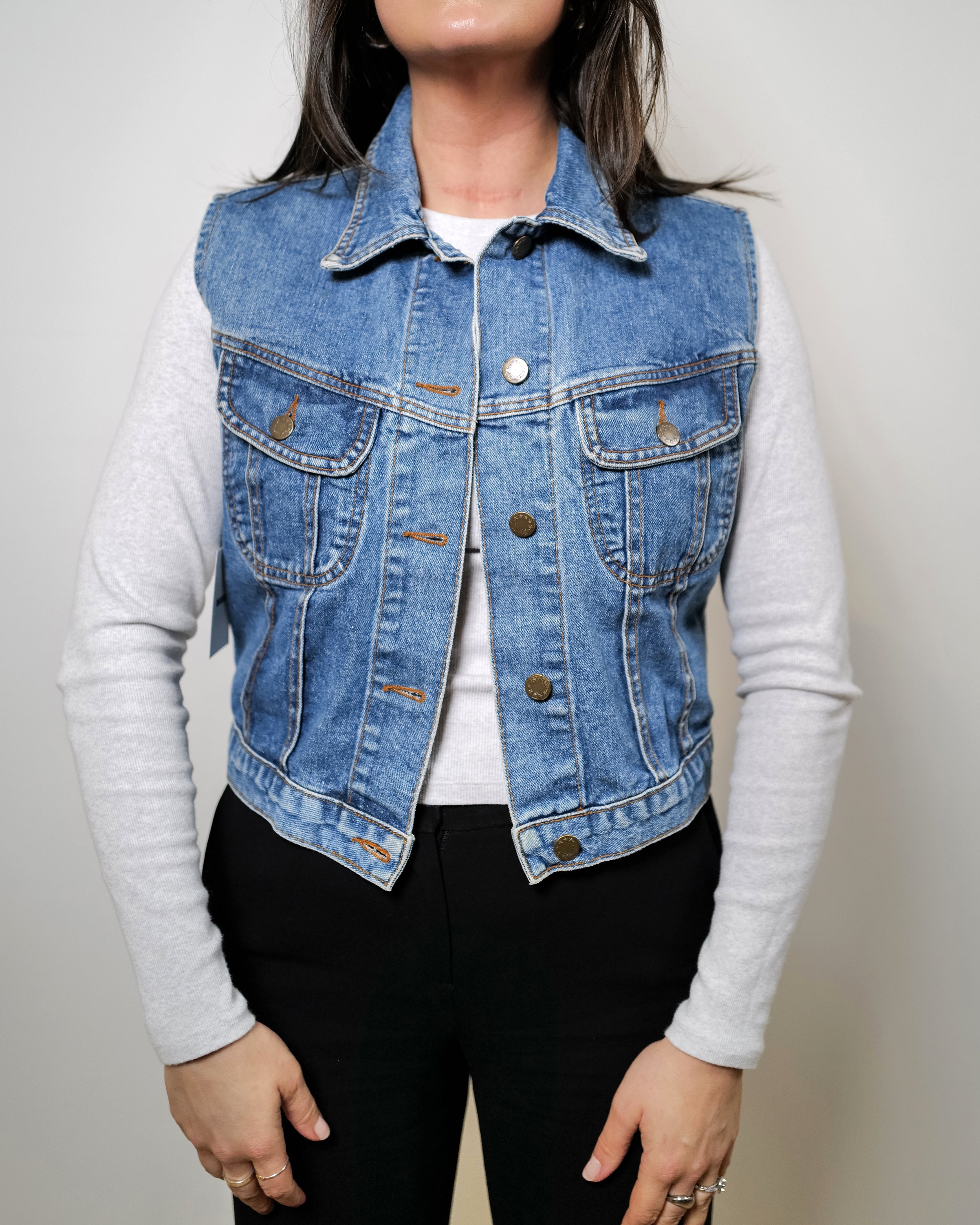 A vintage denim vest, slightly cropped. In great condition. Made in USA.