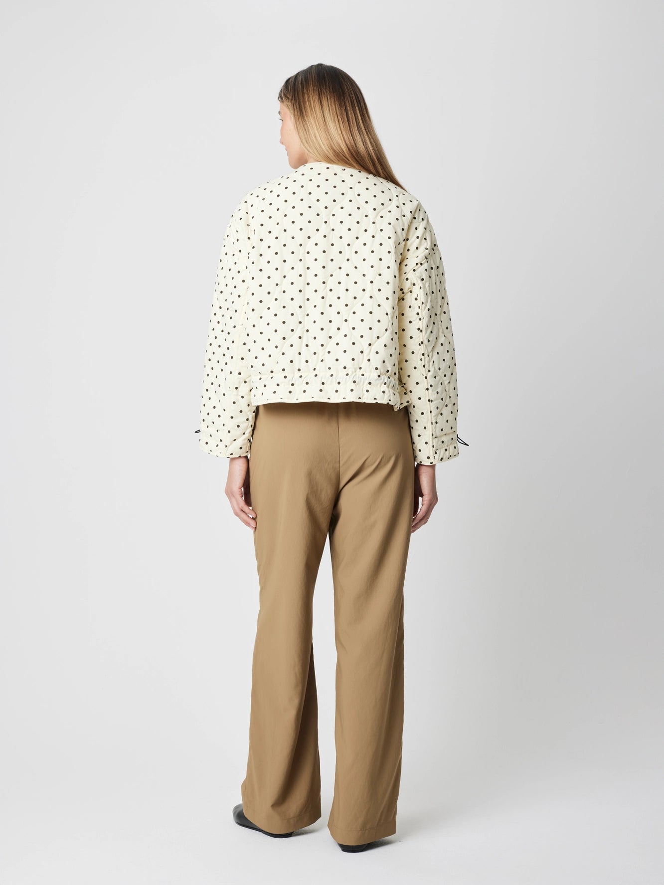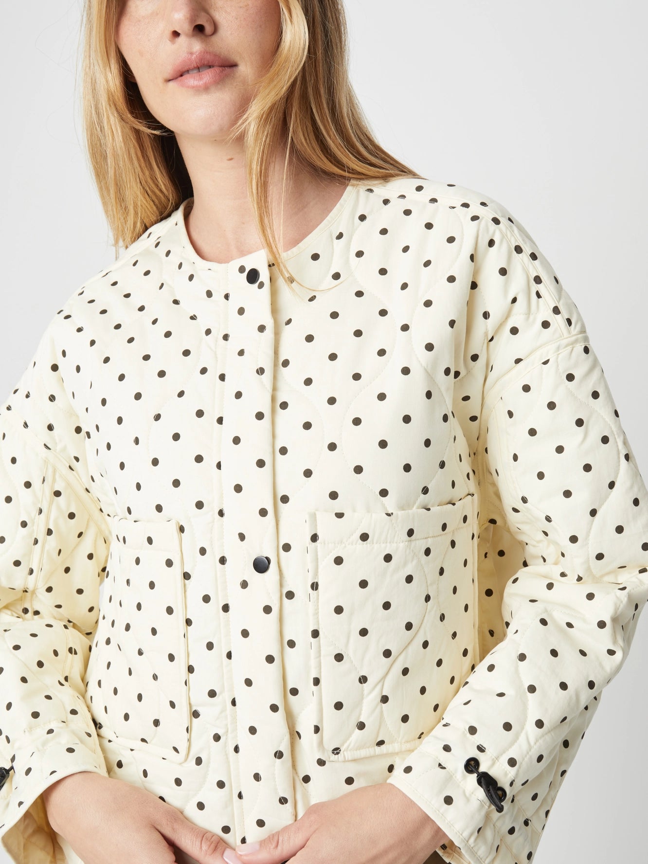 The Liv Jacket is constructed from a quilted, insulated polka dot fabric with a fully lined interior. Cut in a boxy silhouette, it features a clean crew neckline, long sleeves with adjustable drawstring toggle cuffs, and front patch pockets. Finished with a full snap-and-zip closure and an adjustable drawstring hem for subtle shape control.