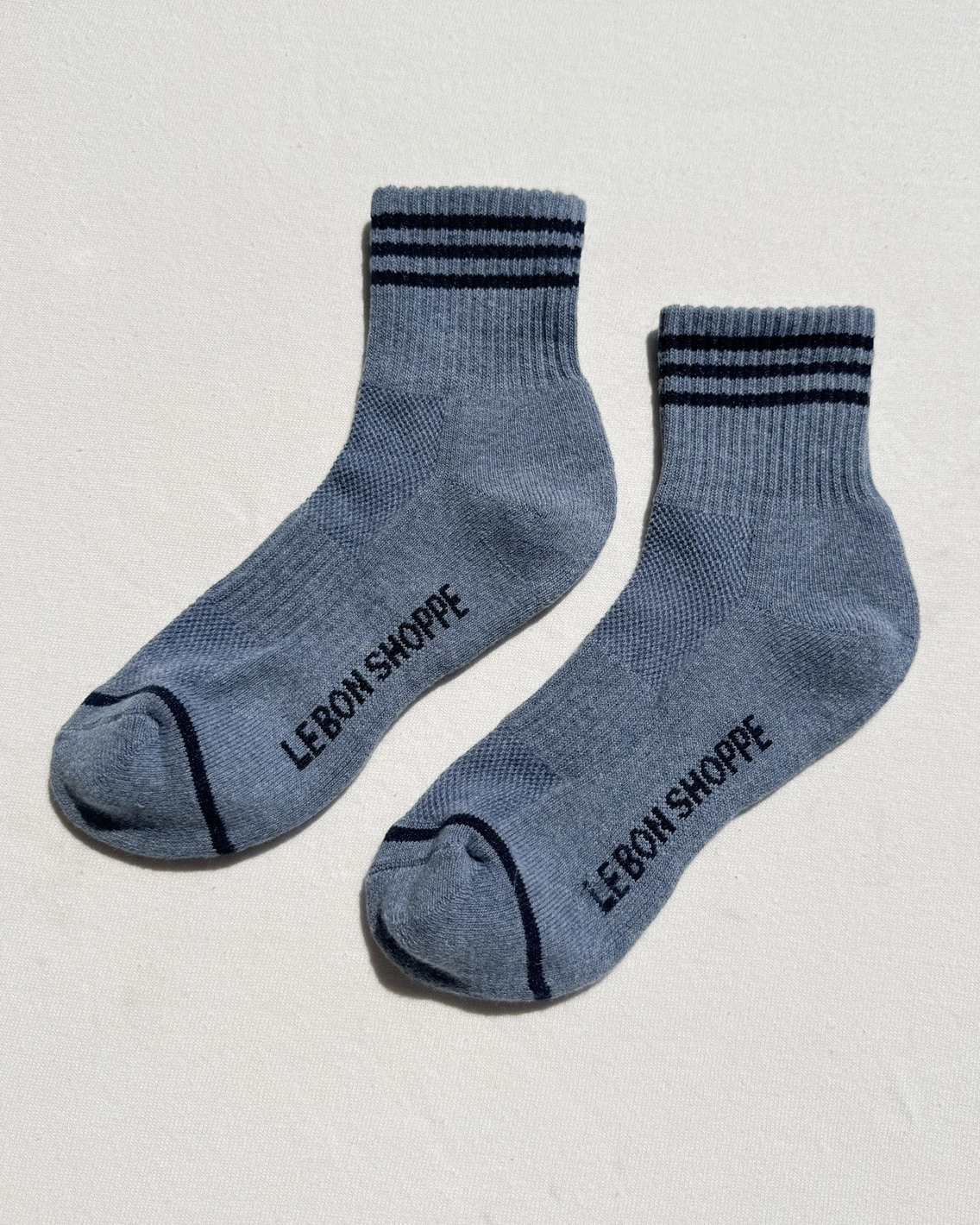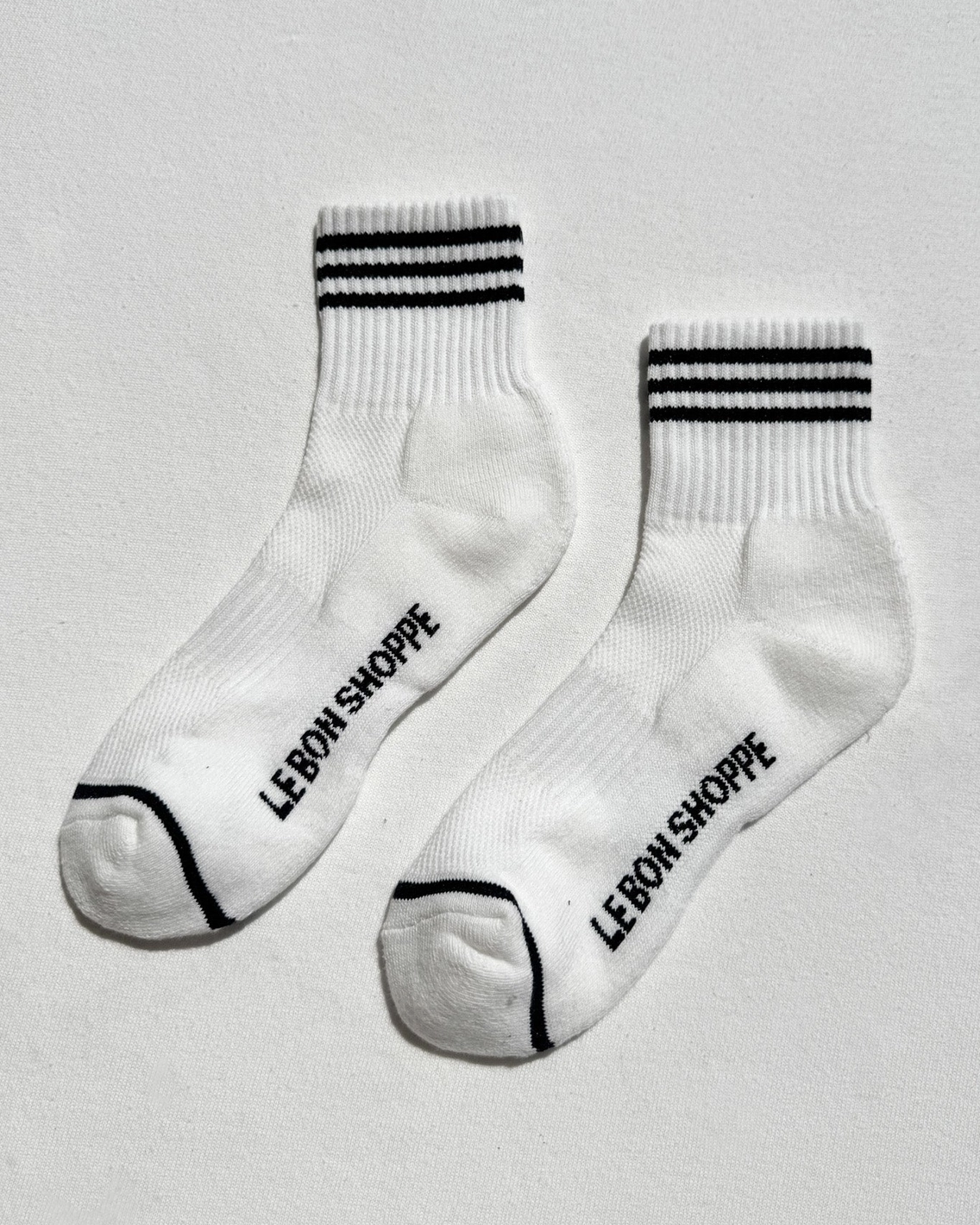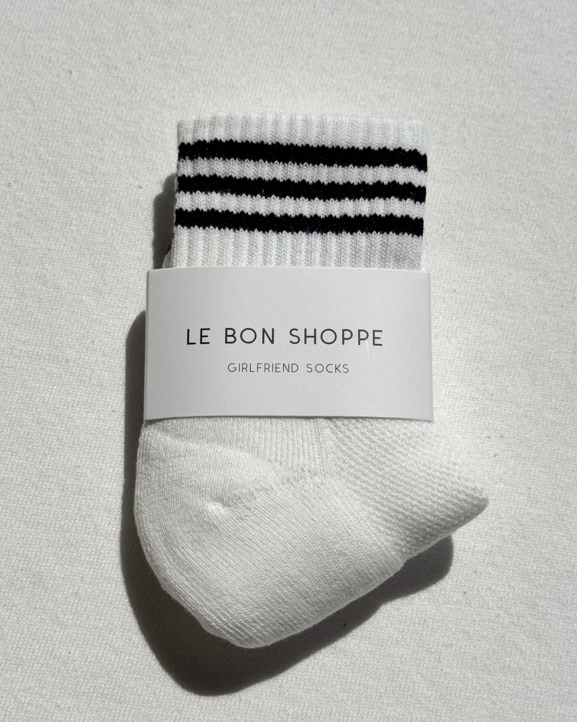 These beauties feature a triple contrast stripe at the opening and a shorter classic crew sock length. She is a universally quintessential sock and especially flattering for our petite ladies.