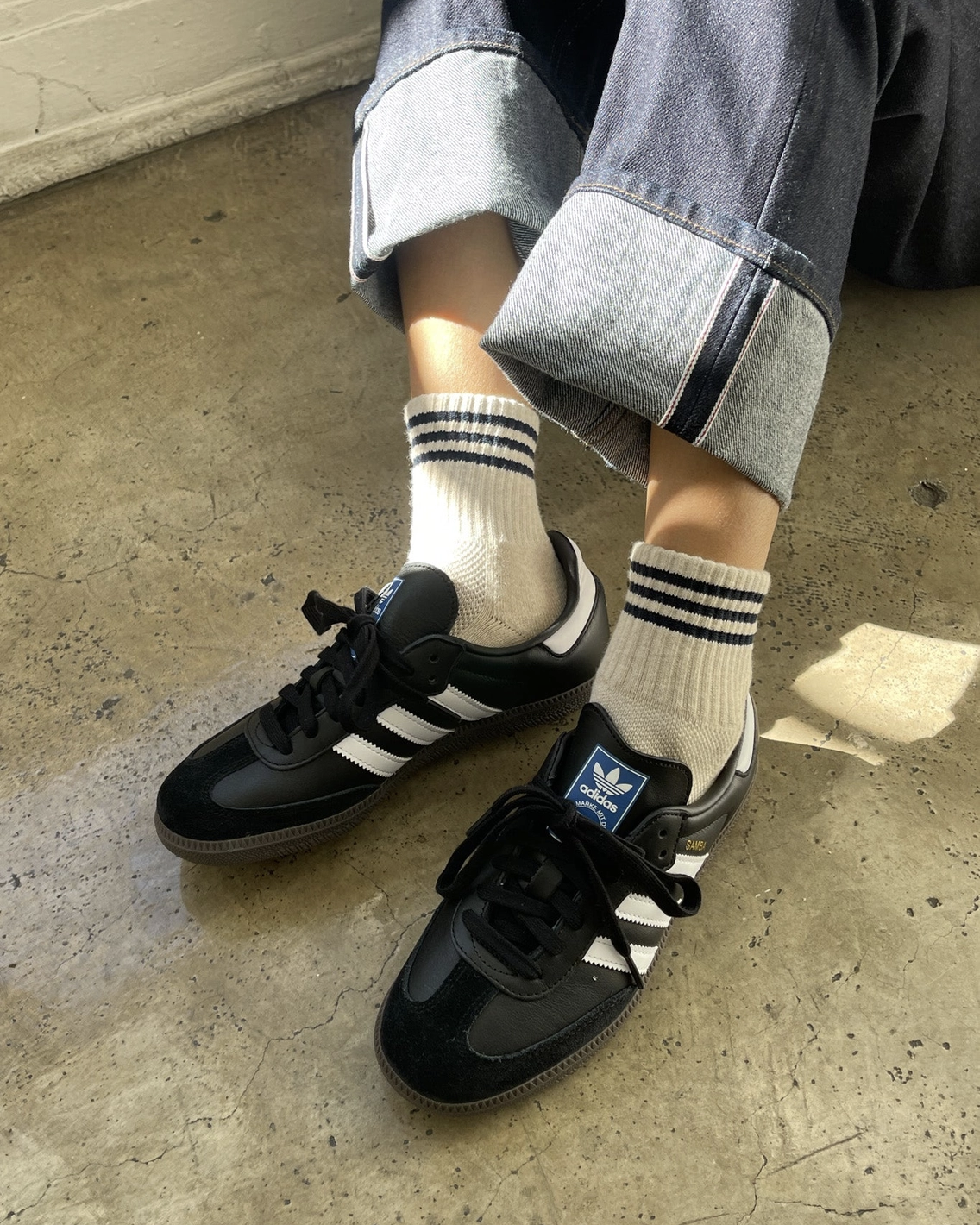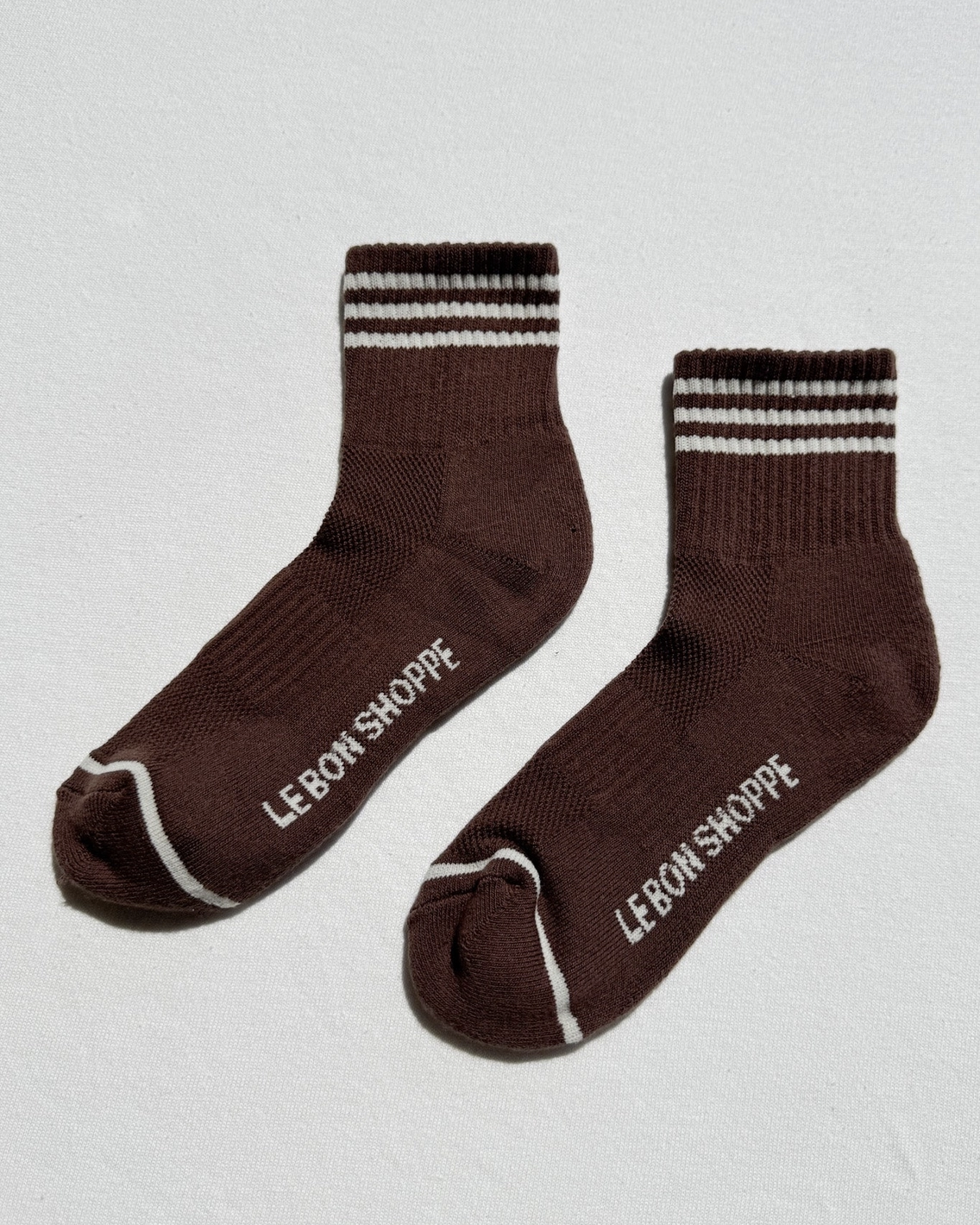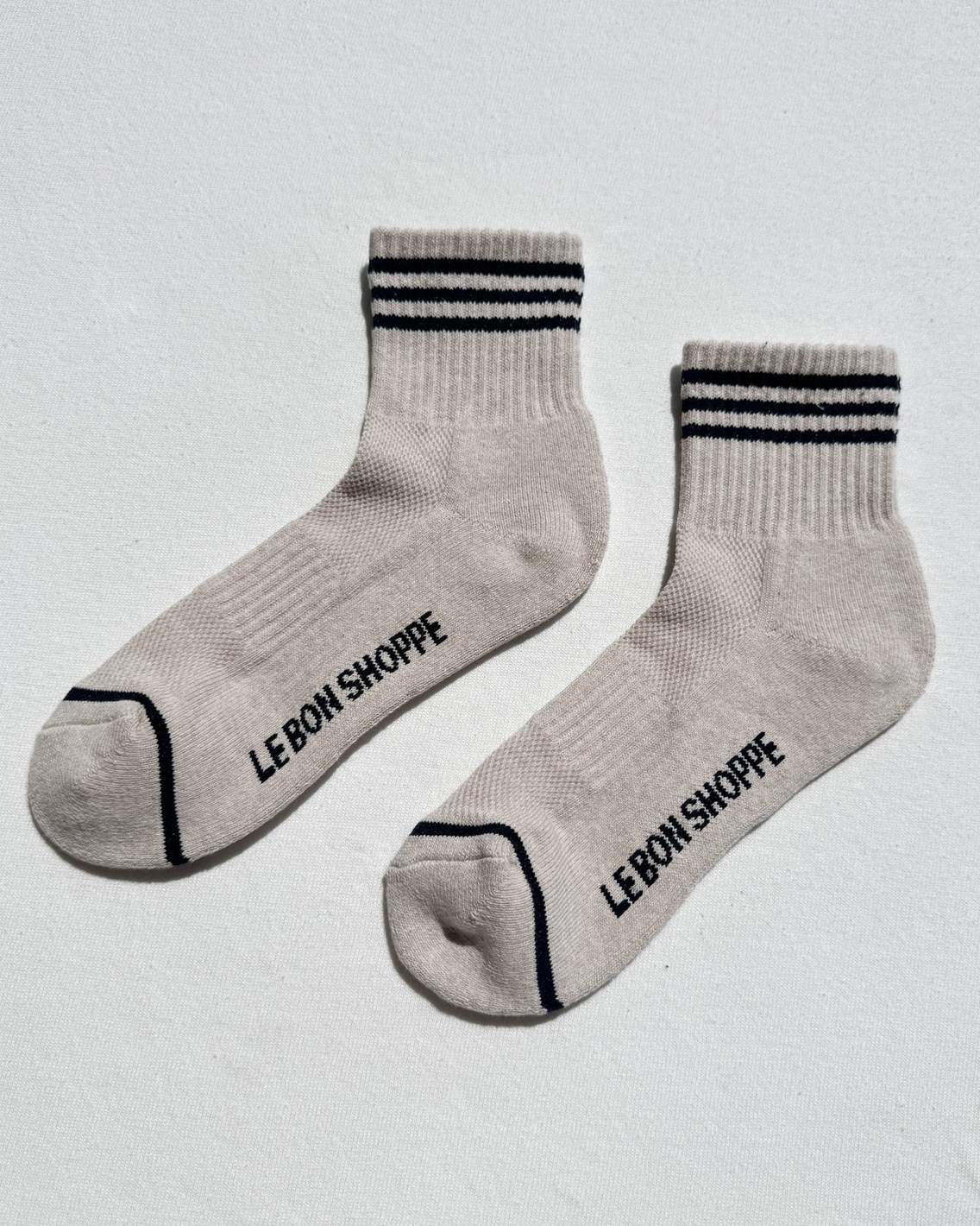 These beauties feature a triple contrast stripe at the opening and a shorter classic crew sock length. She is a universally quintessential sock and especially flattering for our petite ladies.