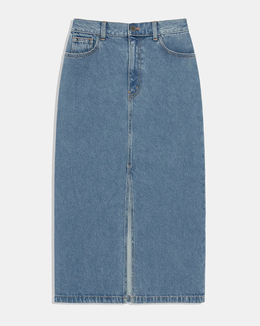 Mid-length denim skirt with front slit and classic five-pocket design. Made in Spain from cotton and recycled cotton.