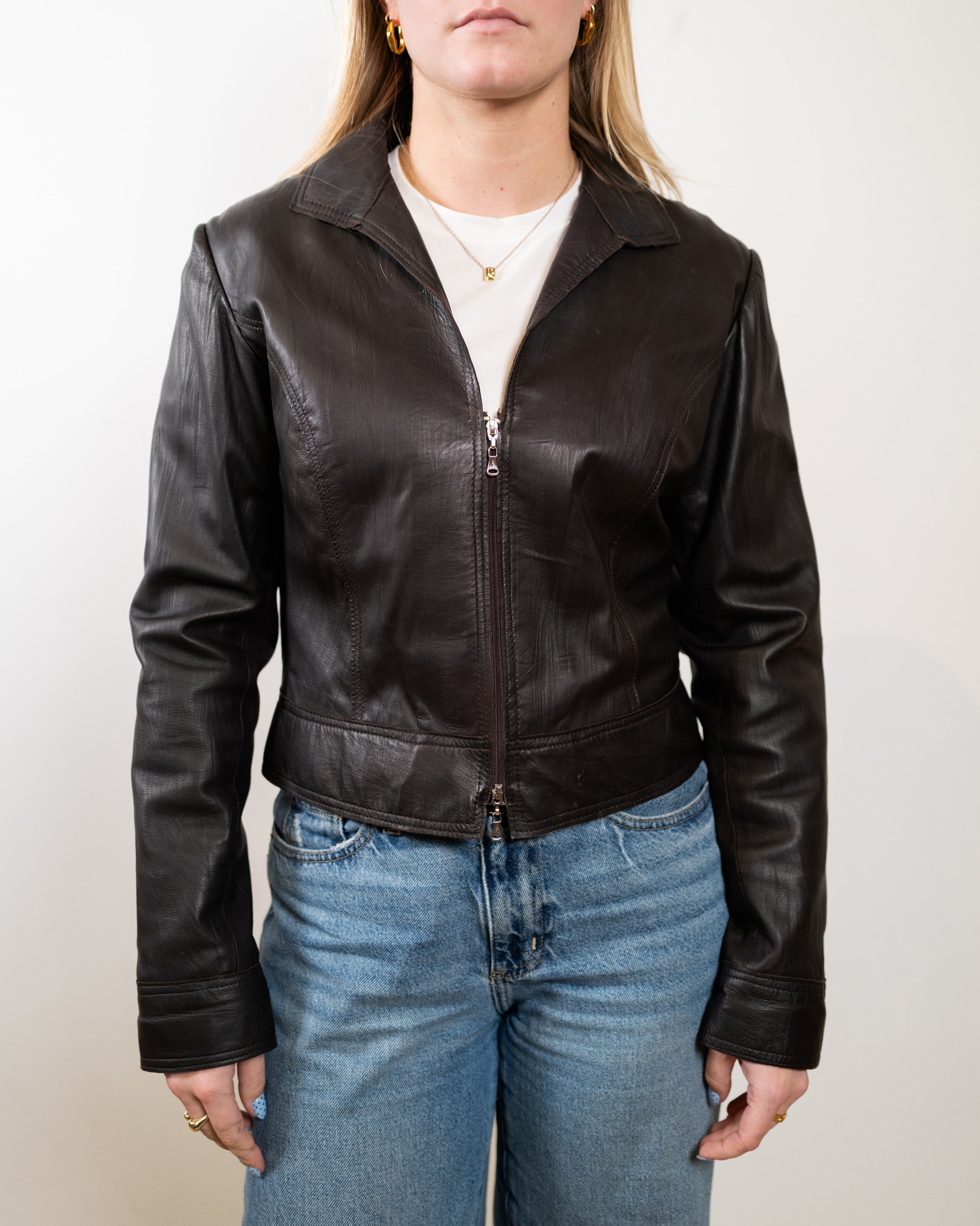 • Vintage Brown Leather Jacket - 2-Way Zip