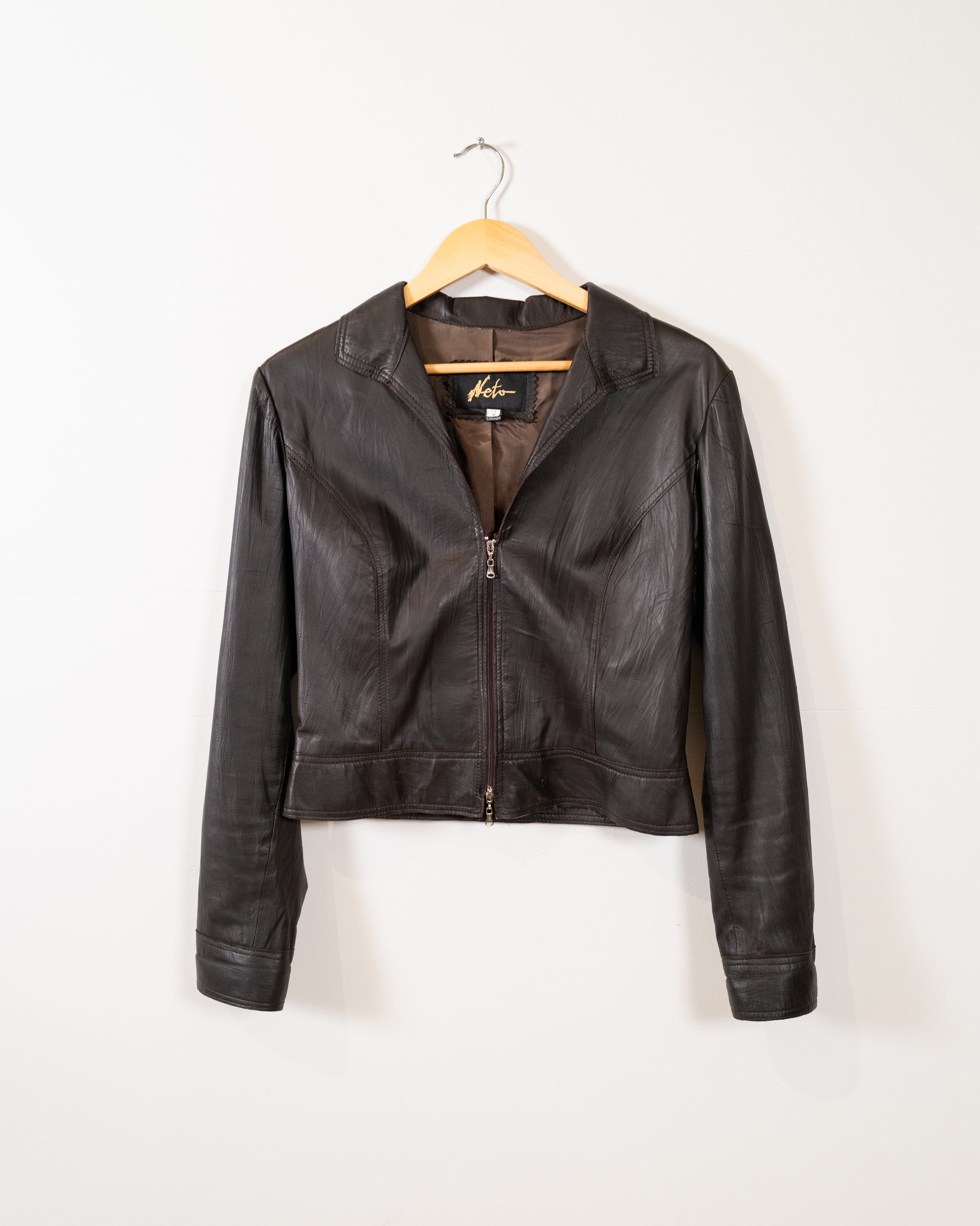 A vintage two-way zip brown leather jacket. Lightweight and great for year round. Leather has a slight texture to it giving it a unique and cool affect. Made in Canada. Jacket is lightweight.