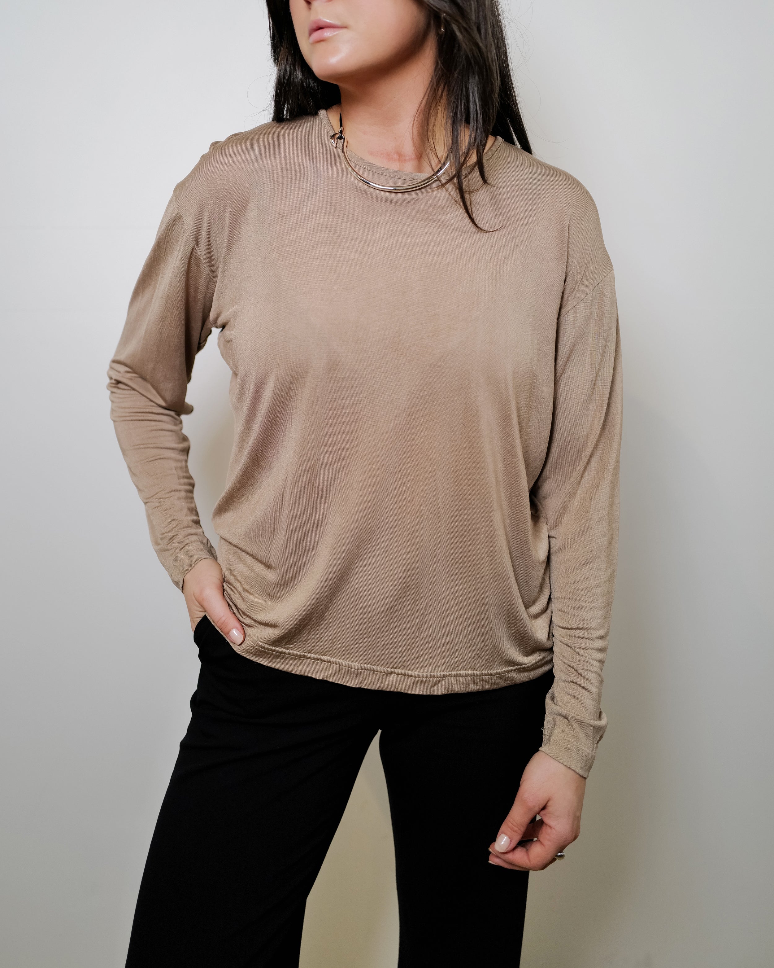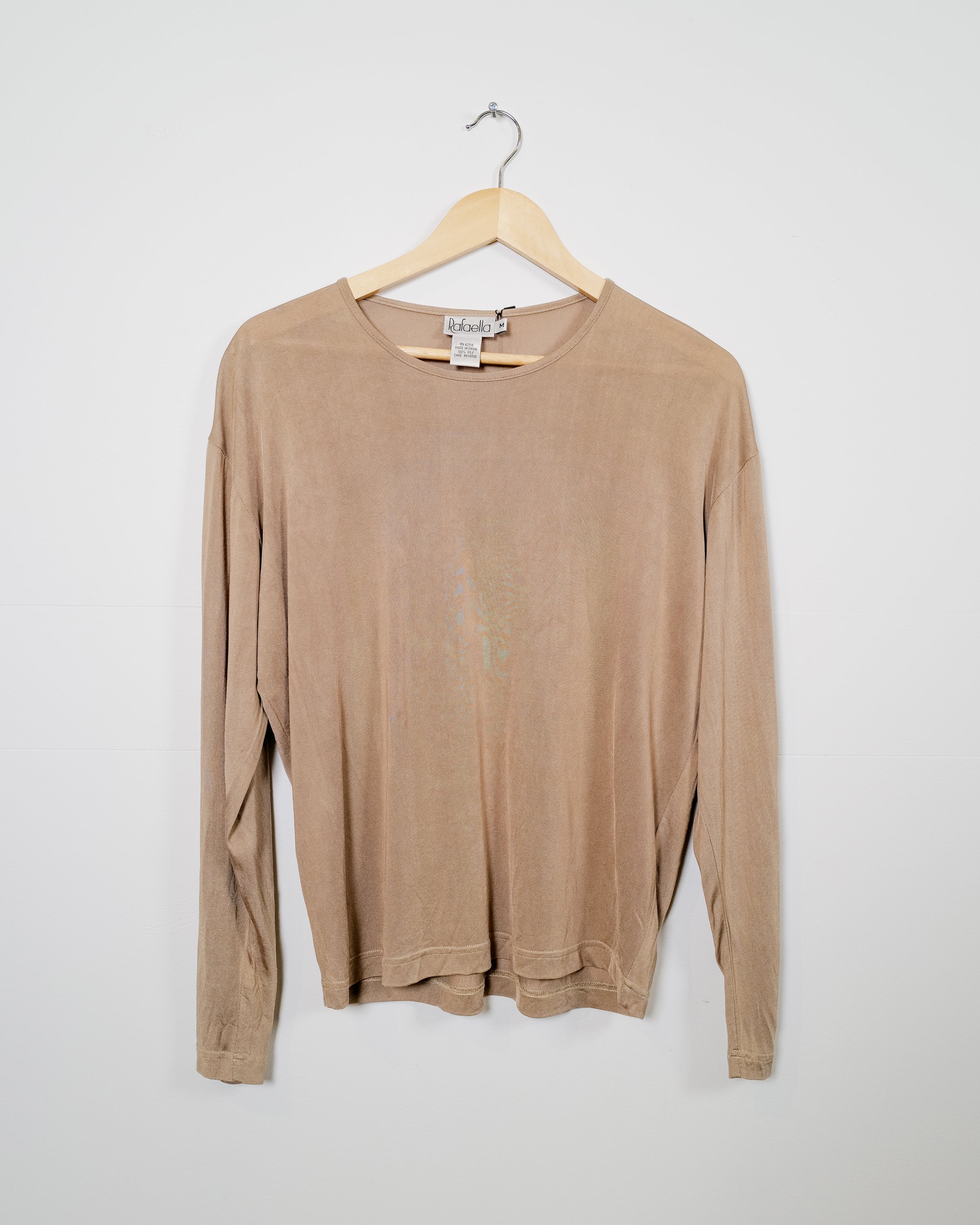 A vintage beige long sleeve silk t-shirt. Super lightweight and airy. In great condition.